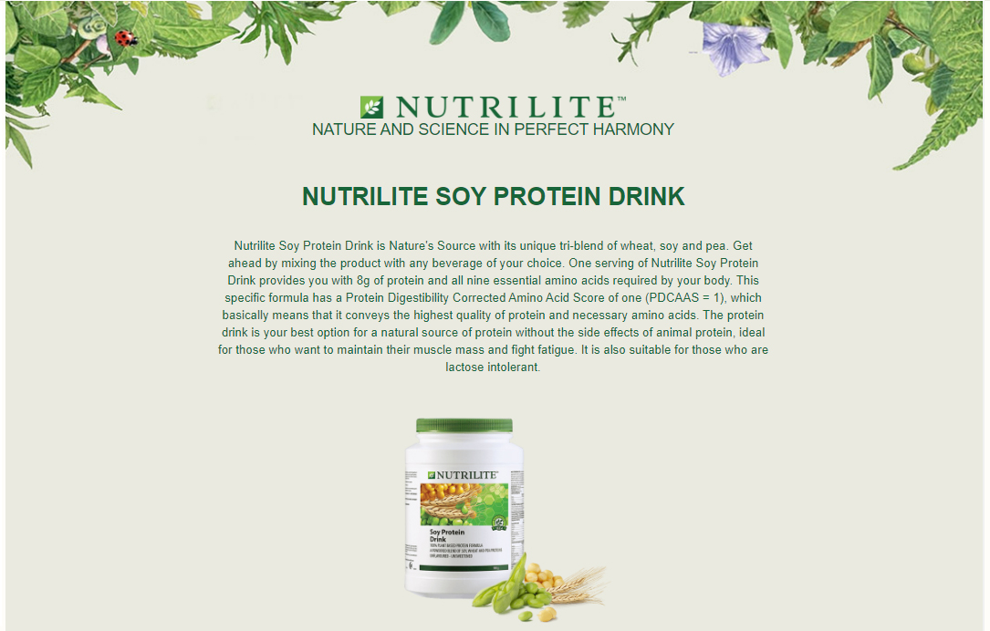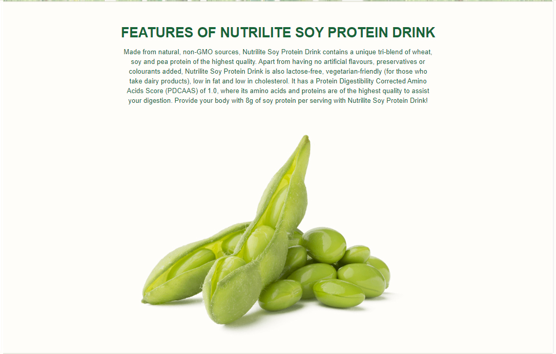❛ โปรตีนคุณภาพ นิวทริไลท์ Soy Protein Drink เป็นโปรตีนสกัดเข้มข้น ให้กรดอะมิโนจำเป็น ปราศจากไขมันและโคเลสเตอรอล ไม่มีส่วนผสมของแลคโตส และเป็นแหล่งโปรตีนทางเลือกเช่นเดียวกับแหล่งโปรตีนอื่นๆ ❜