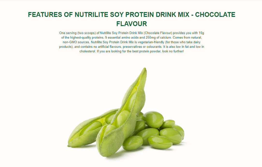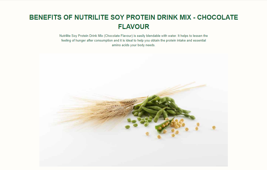 ⋆ โปรตีนคุณภาพ นิวทริไลท์ โปรตีน รสช็อกโกแลต เป็นโปรตีนสกัดจากถั่วเหลืองธรรมชาติ ให้กรดอะมิโนจำเป็น